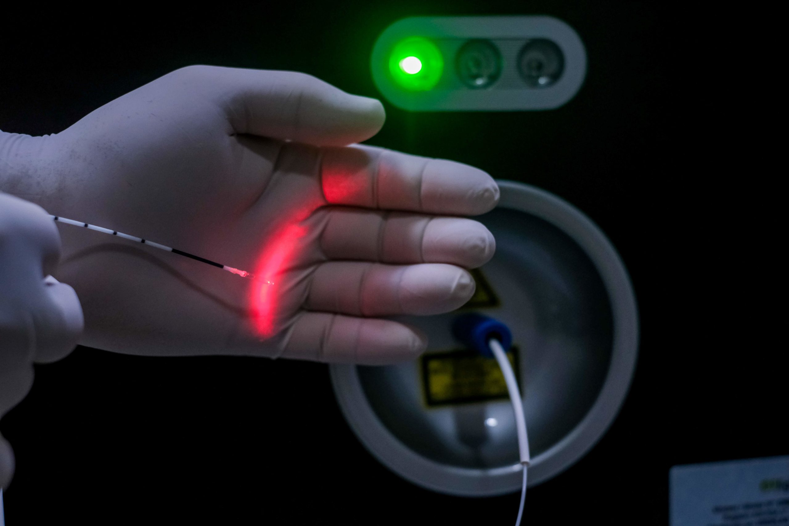 Para a ablação térmica endovenosa utilizamos o laser de diodo de 1470nm. Inserimos um tubo muito fino, a fibra óptica, na safena doente e a localização exata da fibra é vista em tempo real através de ecografia com eco doppler. O calor emitido pelo laser através da ponta da fibra faz com que a veia doente entre em colapso e regrida, sem agredir os tecidos vizinhos.